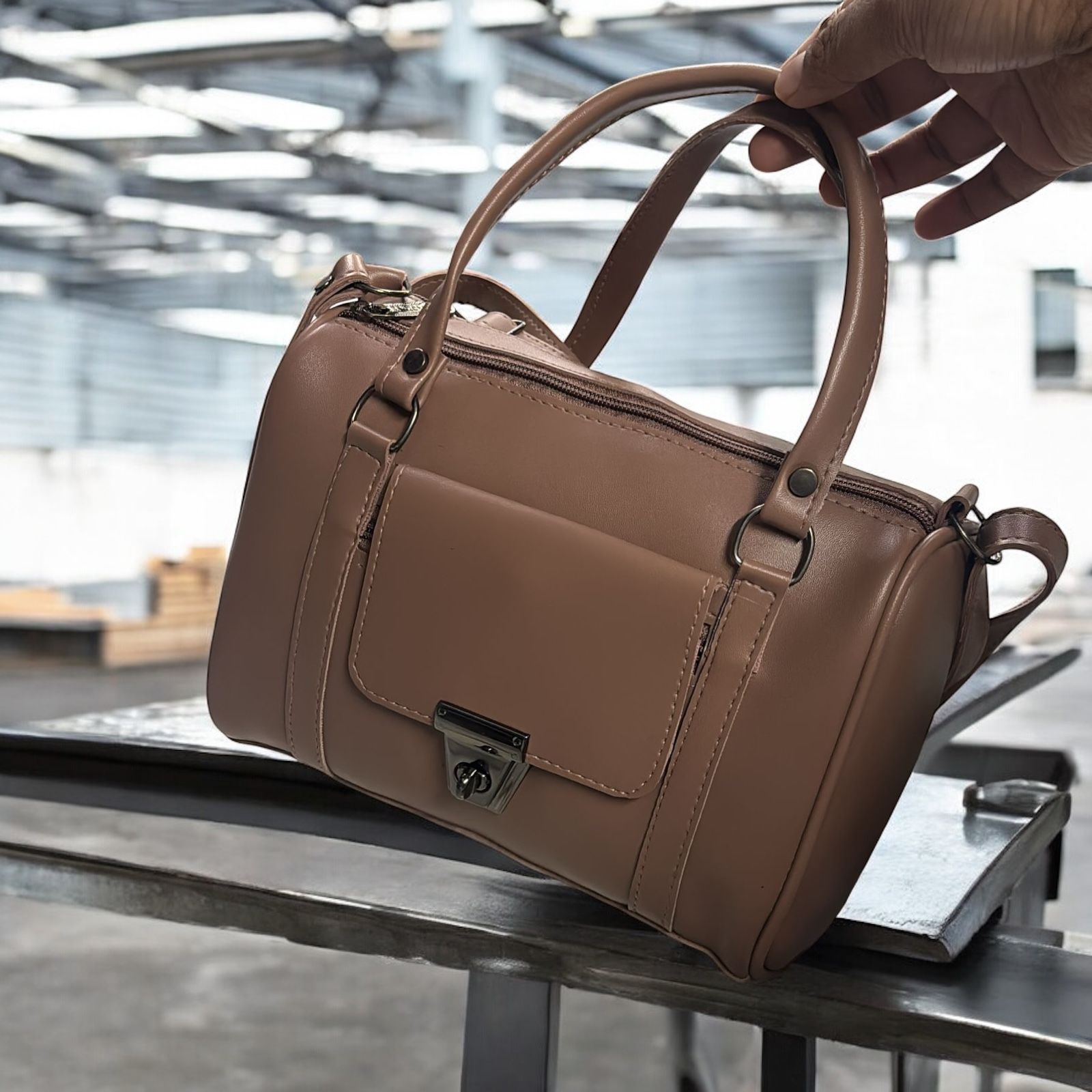 Elegant barrel-style brown handbag with secure lock pocket — premium PU leather for work, travel, and everyday style.
